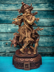 Tamas Brass Handcrafted Lord Krishna Bhagwan Playing Flute with Gau MATA Metal Murti Statue / Idol with Antique Finish (6 x 5.5 x 12 Inches, Brown) (Pack of 1) - Brass / Krishna